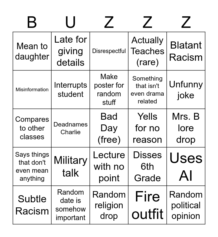 This bingo card has a free space and 29 words: Subtle Racism, Targets Someone, Deadnames Charlie, 20 minute yap sesh, Mean to daughter, Disrespectful, Interrupts student, Military talk, Yells for no reason, Random date is somehow important, Mrs. B lore drop, Random political opinion, Random religion drop, Fire outfit, Unfunny joke, Disses husband, Lecture with no point, Says things that don't even mean anything, Blatant Racism, Compares to other classes, Disses 6th Grade, Sends kids to the office for IDs, Something that isn't even drama related, Misinformation, Actually Teaches (rare), Late for giving details, Uses AI, Make poster for random stuff and Impossible assignment due the same day.