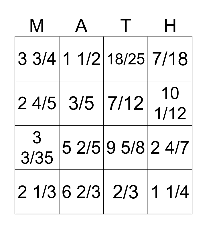 This bingo card has 16 words: 6 2/3, 2 4/7, 18/25, 3 3/4, 3 3/35, 1 1/2, 9 5/8, 2/3, 2 4/5, 3/5, 2 1/3, 7/18, 5 2/5, 10 1/12, 7/12 and 1 1/4.