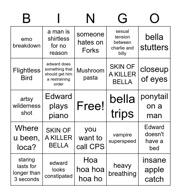 This bingo card has a free space and 34 words: someone says the word monkey, heavy breathing, too much blinking, face makeup is paler than neck, Where u been, loca?, edward does something that should get him a restraining order, bella stutters, staring lasts for longer than 3 seconds, a man is shirtless for no reason, bella touches her hair, Mushroom pasta, someone hates on Forks, crappy 00's cell phone, vampires play baseball, bella trips, closeup of eyes, edward looks constipated, artsy wilderness shot, SKIN OF A KILLER BELLA, vampire superspeed, you want to call CPS, guyliner, emo breakdown, ponytail on a man, Hoa hoa hoa hoa ho, insane apple catch, sexual tension between charlie and billy, Alice has a vision, SKIN OF A KILLER BELLA, Flightless Bird, Edward does weird finger, Edward plays piano, Edward doesn't have a bed and FLANNEL.