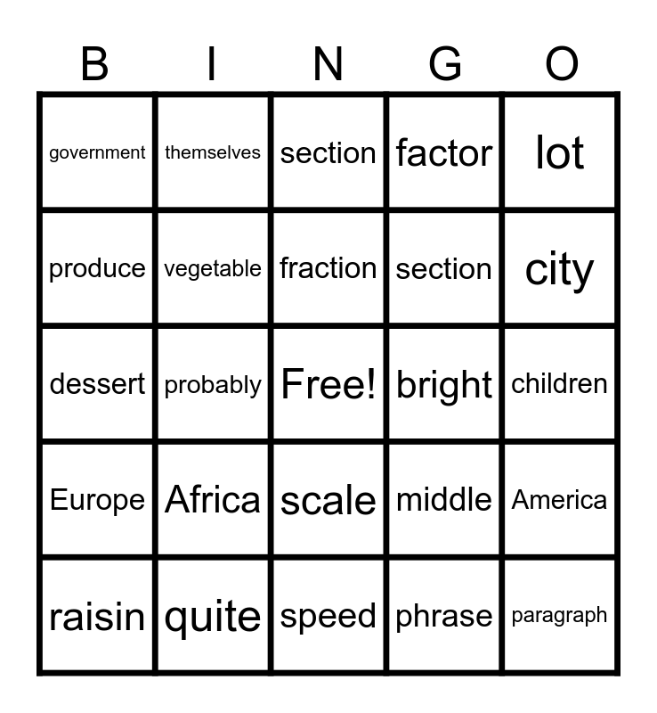 This bingo card has a free space and 24 words: raisin, Africa, fraction, phrase, lot, government, themselves, section, bright, children, dessert, vegetable, middle, America, produce, quite, speed, factor, city, Europe, probably, scale, section and paragraph.