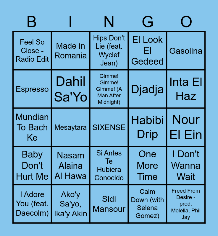This bingo card has a free space and 60 words: (It Goes Like) Nanana - Edit, Ako'y Sa'yo, Ika'y Akin, APT, Baby Don't Hurt Me, Calm Down (with Selena Gomez), Cha-Cha-Cha, Dahil Sa'Yo, Danza Kuduro, Djadja, Dragostea Din Tei, El Look El Gedeed, El Yom El Helw Da, Espresso, Eye of the Tiger, Eyy Banane, Feel So Close - Radio Edit, Freed From Desire - prod. Molella, Phil Jay, Gasolina, Get Lucky (Radio Edit) [feat. Pharrell Williams and Nile Rodgers], Gimme! Gimme! Gimme! (A Man After Midnight), Habibi Drip, Hips Don't Lie (feat. Wyclef Jean), I Adore You (feat. Daecolm), I Don't Wanna Wait, Ikaw Lang Ang Aking Mahal, Ikhtiyarati, Illuminati - From "Aavesham", I'm Good (Blue), Inta El Haz, Kalapakkaara (From "King of Kotha"), Koode Thullu, La Vida, Levitating, Macarena, Made in Romania, Memories (feat. Kid Cudi) [2021 Remix], Men Nazra, Mesaytara, Move, Mundian To Bach Ke, Musica, Nasam Alaina Al Hawa, Nour El Ein, One Kiss (with Dua Lipa), One More Time, Otso Otso, Pacha Parishkari, Ramenez la coupe à la maison, Sapés comme jamais (feat. Niska) - Pilule bleue, Si Antes Te Hubiera Conocido, Sidi Mansour, The Ketchup Song (Aserejé) - Spanish Version, Venus, Volare (Nel Blu di Pinto di Blu), Wannabe, Ya Agmal Eyoun, Ya Sidi Ensa, Ya Tabtab Wa Dallaa, Yeah! (feat. Lil Jon & Ludacris) and YMCA.