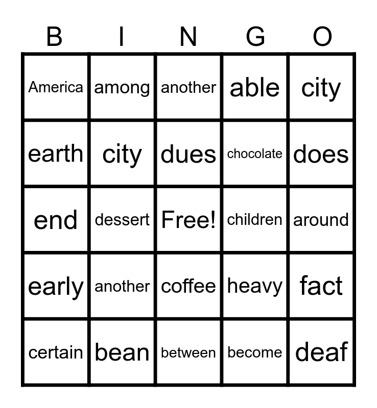 This bingo card has a free space and 24 words: certain, another, dues, become, city, America, among, another, children, around, end, city, heavy, fact, earth, bean, between, able, does, early, dessert, coffee, chocolate and deaf.