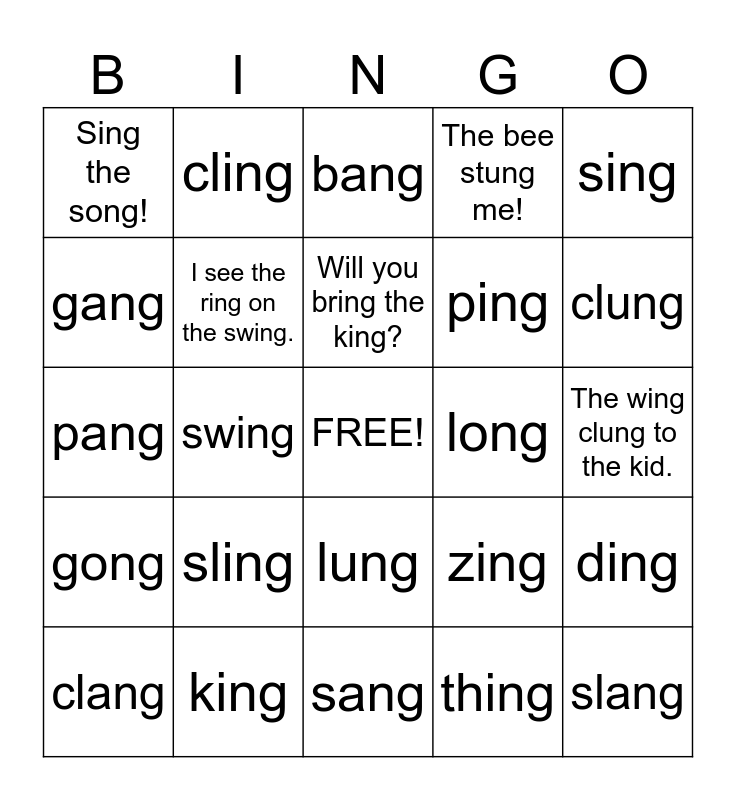 This bingo card has a free space and 24 words: clang, sling, Will you bring the king?, thing, sing, Sing the song!, cling, bang, long, The wing clung to the kid., pang, I see the ring on the swing., zing, ding, gang, king, sang, The bee stung me!, clung, gong, swing, lung, ping and slang.