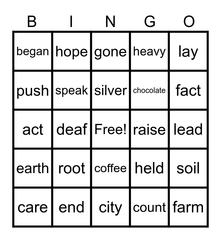 This bingo card has a free space and 24 words: care, root, silver, count, lay, began, hope, gone, raise, lead, act, speak, held, soil, push, end, city, heavy, fact, earth, deaf, coffee, chocolate and farm.