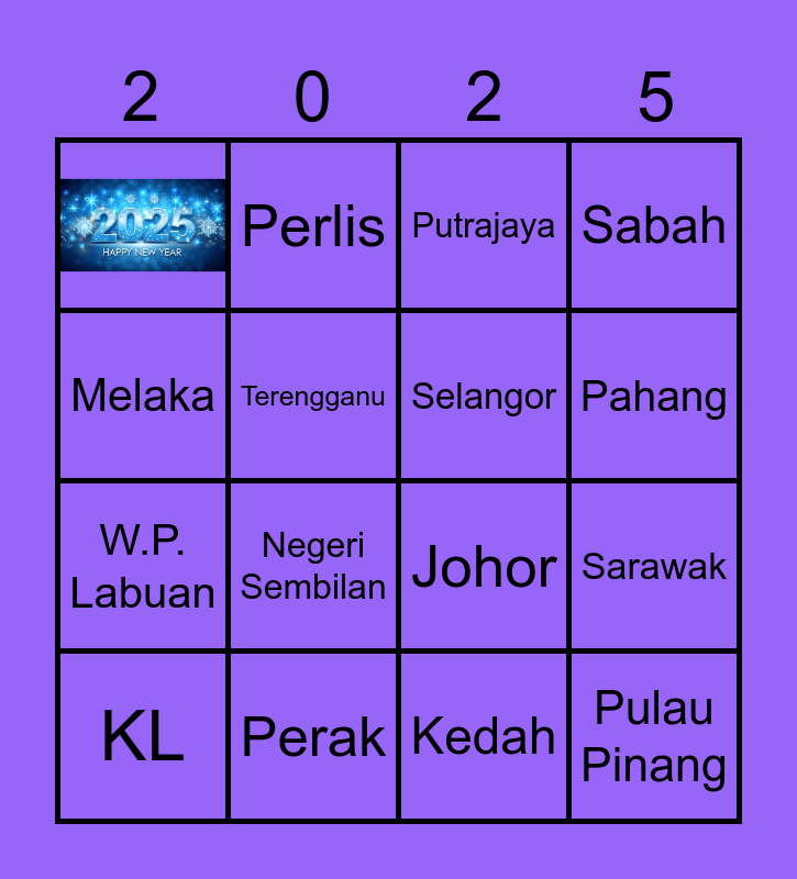 This bingo card has 1 images and 15 words: KL, Perak, Putrajaya, Sabah, Melaka, Perlis, Johor, Sarawak, Terengganu, Kedah, Pahang, W.P. Labuan, Negeri Sembilan, Selangor and Pulau Pinang.