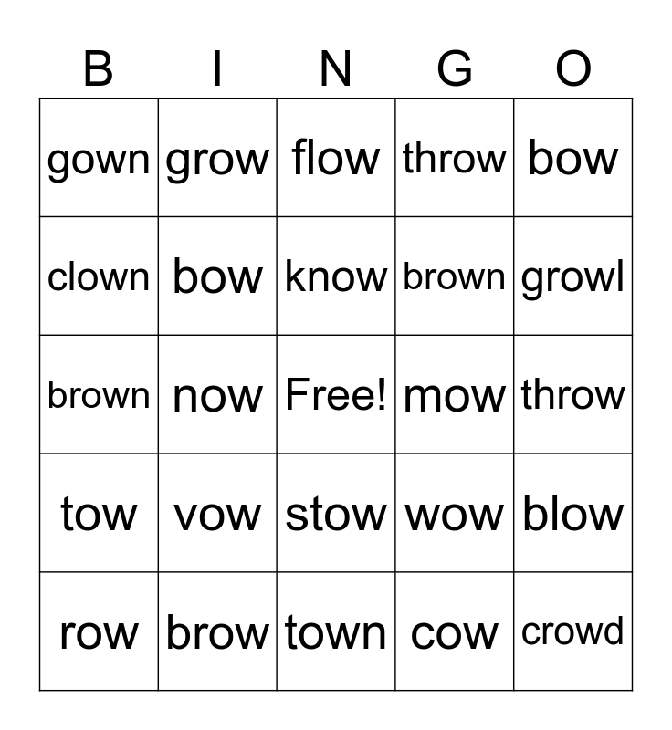 This bingo card has a free space and 32 words: cow, crow, now, sow, tow, bow, bow, blow, grow, show, know, flow, how, low, mow, pow, row, brown, stow, vow, wow, snow, throw, brow, crowd, throw, brown, clown, gown, town, frown and growl.