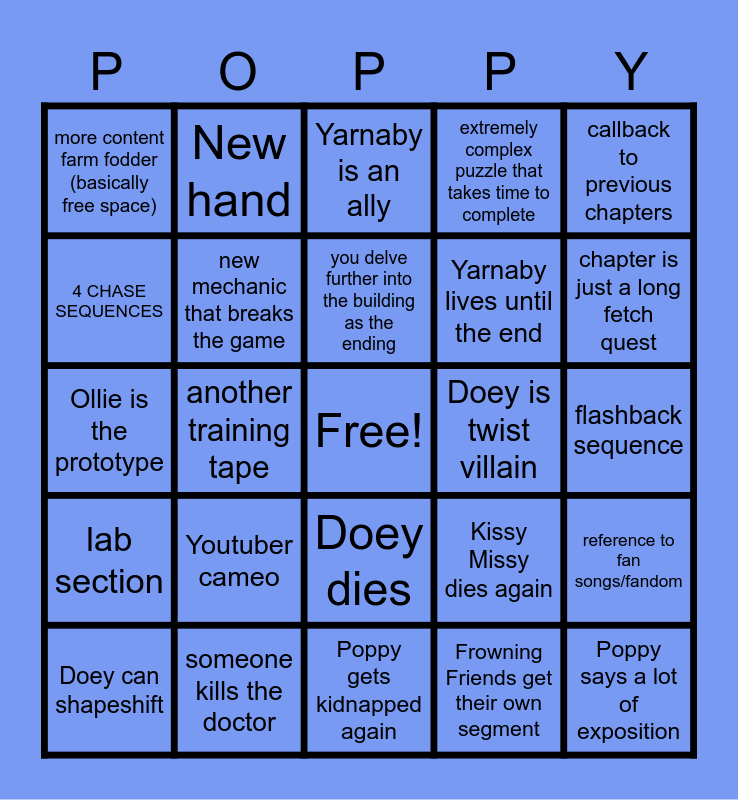 This bingo card has a free space and 24 words: Youtuber cameo, someone kills the doctor, you delve further into the building as the ending, Doey can shapeshift, callback to previous chapters, more content farm fodder (basically free space), 4 CHASE SEQUENCES, New hand, Doey is twist villain, Doey dies, Yarnaby lives until the end, Ollie is the prototype, Kissy Missy dies again, reference to fan songs/fandom, new mechanic that breaks the game, Frowning Friends get their own segment, flashback sequence, Yarnaby is an ally, chapter is just a long fetch quest, another training tape, Poppy says a lot of exposition, lab section, extremely complex puzzle that takes time to complete and Poppy gets kidnapped again.