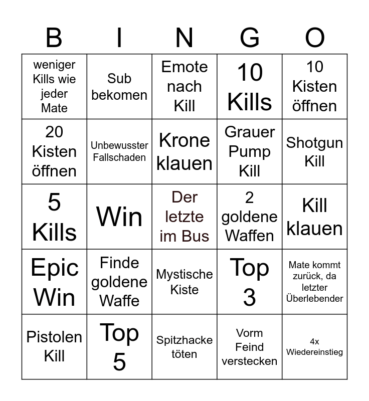This bingo card has a free space and 24 words: Finde goldene Waffe, Top 5, Krone klauen, Pistolen Kill, 10 Kisten öffnen, weniger Kills wie jeder Mate, 20 Kisten öffnen, Sub bekomen, 2 goldene Waffen, Mystische Kiste, Grauer Pump Kill, 5 Kills, Top 3, Mate kommt zurück, da letzter Überlebender, Unbewusster Fallschaden, Vorm Feind verstecken, Kill klauen, Emote nach Kill, Shotgun Kill, Win, 4x Wiedereinstieg, Epic Win, 10 Kills and Spitzhacke töten.