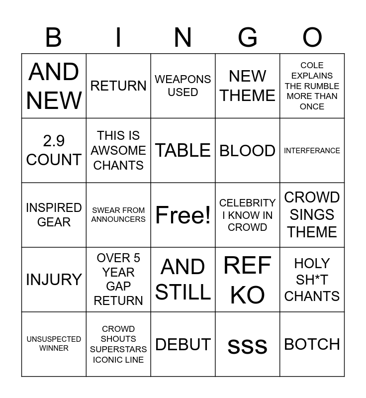 This bingo card has a free space and 25 words: OVER 5 YEAR GAP RETURN, DEBUT, TABLE, UNSUSPECTED WINNER, COLE EXPLAINS THE RUMBLE MORE THAN ONCE, AND NEW, 2.9 COUNT, RETURN, CELEBRITY I KNOW IN CROWD, AND STILL, BLOOD, INSPIRED GEAR, REF KO, HOLY SH*T CHANTS, THIS IS AWSOME CHANTS, ANOUNCERS TABLE BREAKS, CROWD SINGS THEME, WEAPONS USED, INTERFERANCE, SWEAR FROM ANNOUNCERS, BOTCH, CROWD SHOUTS SUPERSTARS ICONIC LINE, INJURY, NEW THEME and sss.