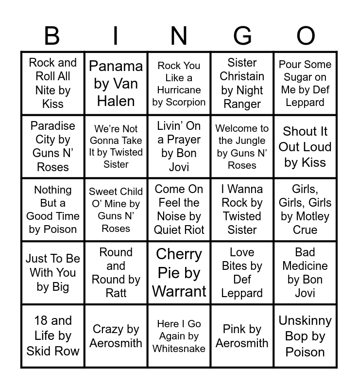 This bingo card has 25 words: Round and Round by Ratt, Here I Go Again by Whitesnake, Livin’ On a Prayer by Bon Jovi, 18 and Life by Skid Row, Pour Some Sugar on Me by Def Leppard, Rock and Roll All Nite by Kiss, Paradise City by Guns N’ Roses, Panama by Van Halen, I Wanna Rock by Twisted Sister, Cherry Pie by Warrant, Welcome to the Jungle by Guns N’ Roses, Nothing But a Good Time by Poison, Love Bites by Def Leppard, Bad Medicine by Bon Jovi, We’re Not Gonna Take It by Twisted Sister, Unskinny Bop by Poison, Girls, Girls, Girls by Motley Crue, Rock You Like a Hurricane by Scorpion, Shout It Out Loud by Kiss, Sweet Child O’ Mine by Guns N’ Roses, Come On Feel the Noise by Quiet Riot, Crazy by Aerosmith, Just To Be With You by Big, Sister Christain by Night Ranger and Pink by Aerosmith.
