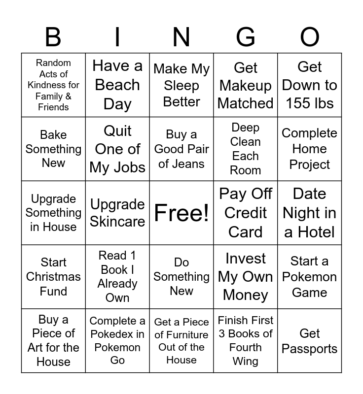 This bingo card has a free space and 24 words: Read 1 Book I Already Own, Complete a Pokedex in Pokemon Go, Buy a Good Pair of Jeans, Buy a Piece of Art for the House, Get Down to 155 lbs, Random Acts of Kindness for Family & Friends, Bake Something New, Have a Beach Day, Pay Off Credit Card, Do Something New, Deep Clean Each Room, Upgrade Something in House, Invest My Own Money, Start a Pokemon Game, Quit One of My Jobs, Finish First 3 Books of Fourth Wing, Date Night in a Hotel, Make My Sleep Better, Complete Home Project, Upgrade Skincare, Get Passports, Start Christmas Fund, Get Makeup Matched and Get a Piece of Furniture Out of the House.