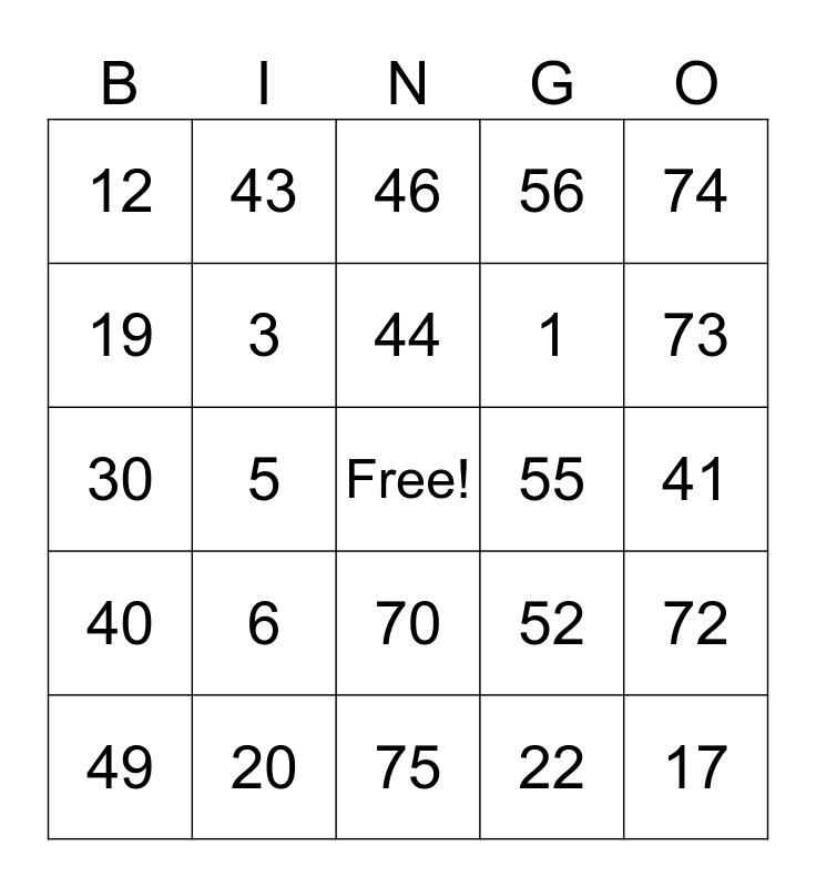 This bingo card has a free space and 24 words: 6, 20, 44, 49, 74, 12, 19, 43, 55, 70, 1, 30, 52, 72, 3, 22, 41, 46, 73, 5, 17, 40, 56 and 75.