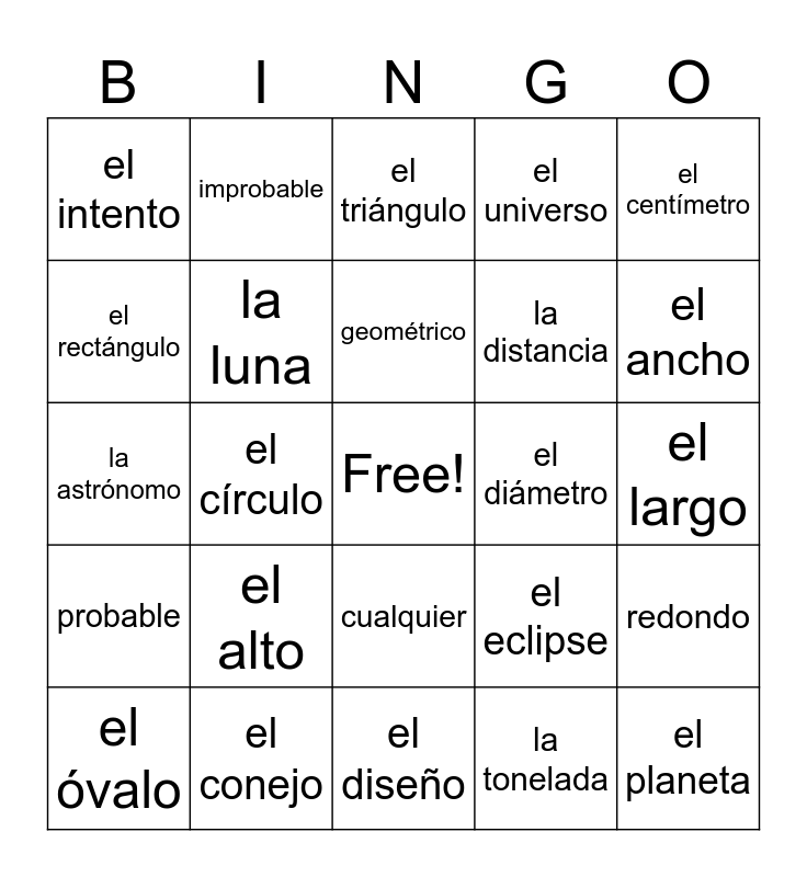This bingo card has a free space and 24 words: el alto, el conejo, geométrico, el óvalo, el centímetro, el intento, el rectángulo, improbable, el diámetro, cualquier, la distancia, la astrónomo, el eclipse, redondo, la luna, la tonelada, el largo, el triángulo, el ancho, el círculo, el planeta, probable, el universo and el diseño.