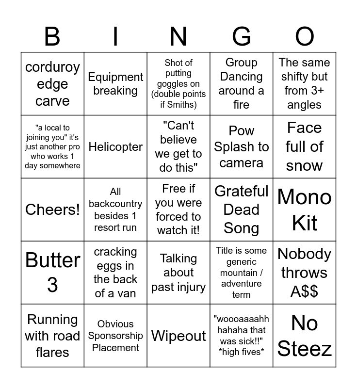 This bingo card has a free space and 24 words: cracking eggs in the back of a van, Obvious Sponsorship Placement, "Can't believe we get to do this", Running with road flares, The same shifty but from 3+ angles, corduroy edge carve, "a local to joining you" it's just another pro who works 1 day somewhere, Equipment breaking, Grateful Dead Song, Talking about past injury, Pow Splash to camera, Cheers!, Title is some generic mountain / adventure term, Nobody throws A$$, Helicopter, "woooaaaahh hahaha that was sick!!" *high fives*, Mono Kit, Shot of putting goggles on (double points if Smiths), Face full of snow, All backcountry besides 1 resort run, No Steez, Butter 3, Group Dancing around a fire and Wipeout.