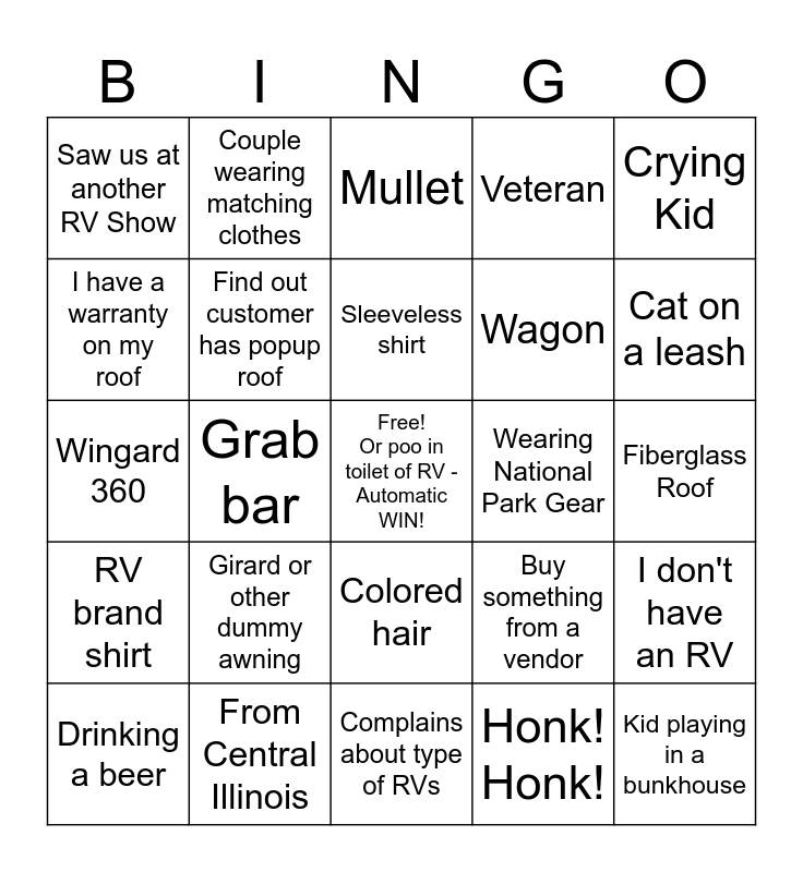 This bingo card has a free space and 24 words: Girard or other dummy awning, From Central Illinois, Sleeveless shirt, Drinking a beer, Crying Kid, Saw us at another RV Show, I have a warranty on my roof, Couple wearing matching clothes, Wearing National Park Gear, Colored hair, Wagon, Wingard 360, Buy something from a vendor, I don't have an RV, Find out customer has popup roof, Honk! Honk!, Fiberglass Roof, Mullet, Cat on a leash, Grab bar, Kid playing in a bunkhouse, RV brand shirt, Veteran and Complains about type of RVs.