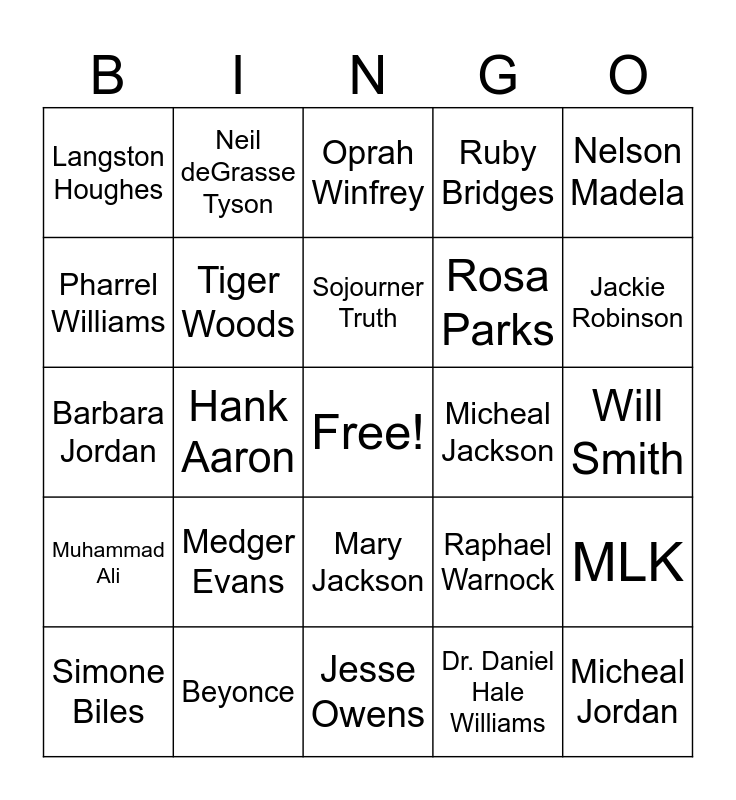 This bingo card has a free space and 38 words: Michelle Obama, Jessie Jackson, Maya Angelou, Tiger Woods, MLK, Medger Evans, Sojourner Truth, Serena Williams, Nelson Madela, Rosa Parks, Hank Aaron, Ruby Bridges, Micheal Jordan, Will Smith, Pharrel Williams, Muhammad Ali, Denzel Washington, Oprah Winfrey, Whiteny Houston, Micheal Jackson, Langston Houghes, Beyonce, Jackie Robinson, Simone Biles, Wilma Rudolph, Jesse Owens, Florence Griffith Joyner, Bill Russell, Althea Gibson, Benjamin Banneker, Percy Lavon Julian, Mary Jackson, Dr. Daniel Hale Williams, Neil deGrasse Tyson, Cory Booker, Raphael Warnock, Barbara Jordan and Stacey Abrams.