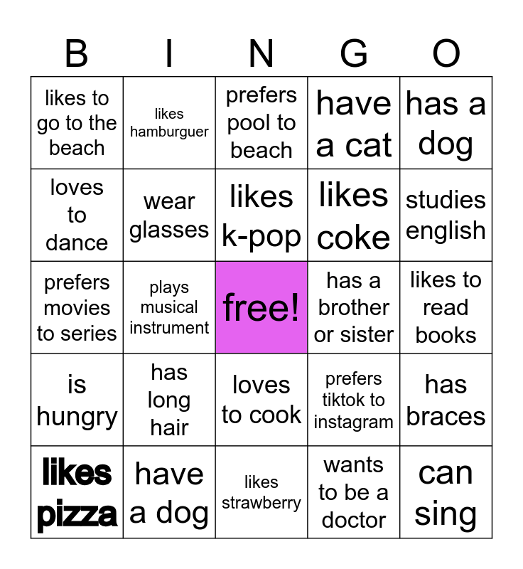 This bingo card has a free space and 29 words: likes pizza, is 11 years old, plays musical instrument, likes coffee, likes to go to the beach, prefers pool to beach, wear glasses, has long hair, has a brother or sister, have a dog, likes to read books, can sing, likes strawberry, wants to be a doctor, studies english, needs to dring water, loves to cook, is hungry, has a dog, prefers movies to series, prefers tiktok to instagram, likes orange juice, likes coke, loves to dance, have a cat, likes hamburguer, has braces, likes k-pop and is nine years old.
