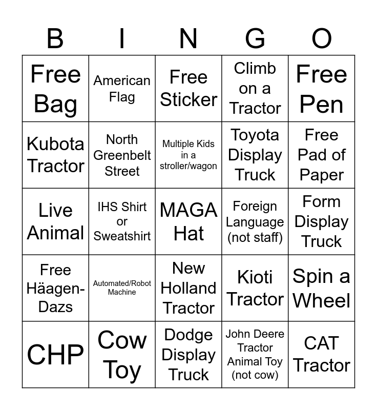This bingo card has a free space and 35 words: Raisins, CVC Shirt or Sweatshirt, Free Fly Swatter, North Greenbelt Street, New Holland Tractor, Climb on a Tractor, Kubota Tractor, Church Lay Elder, Multiple Kids in a stroller/wagon, Pistachios, Live Animal, Free Pen, Midwest Mennonites, Church Member, Free Bag, Foreign Language (not staff), John Deere Tractor Animal Toy (not cow), IHS Shirt or Sweatshirt, Free Häagen-Dazs, CAT Tractor, Kioti Tractor, CHP, Spin a Wheel, Cow Toy, Free Sticker, Free Pad of Paper, Polaris, Wind Machine, Toyota Display Truck, Form Display Truck, Chevy Display Truck, Dodge Display Truck, Automated/Robot Machine, American Flag and Black Cowboy Hat.