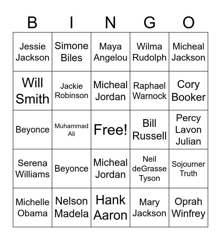 ⚠ This card has duplicate items: Michelle Obama (2), Jessie Jackson (2), Maya Angelou (2), Tiger Woods (2), MLK (2), Medger Evans (2), Sojourner Truth (2), Serena Williams (2), Nelson Madela (2), Rosa Parks (2), Hank Aaron (2), Ruby Bridges (2), Micheal Jordan (2), Will Smith (2), Pharrel Williams (2), Muhammad Ali (2), Denzel Washington (2), Oprah Winfrey (2), Whiteny Houston (2), Micheal Jackson (2), Langston Houghes (2), Beyonce (2), Jackie Robinson (2), Simone Biles (2), Wilma Rudolph (2), Jesse Owens (2), Florence Griffith Joyner (2), Bill Russell (2), Althea Gibson (2), Benjamin Banneker (2), Percy Lavon Julian (2), Mary Jackson (2), Dr. Daniel Hale Williams (2), Neil deGrasse Tyson (2), Cory Booker (2), Raphael Warnock (2), Barbara Jordan (2), Stacey Abrams (2)