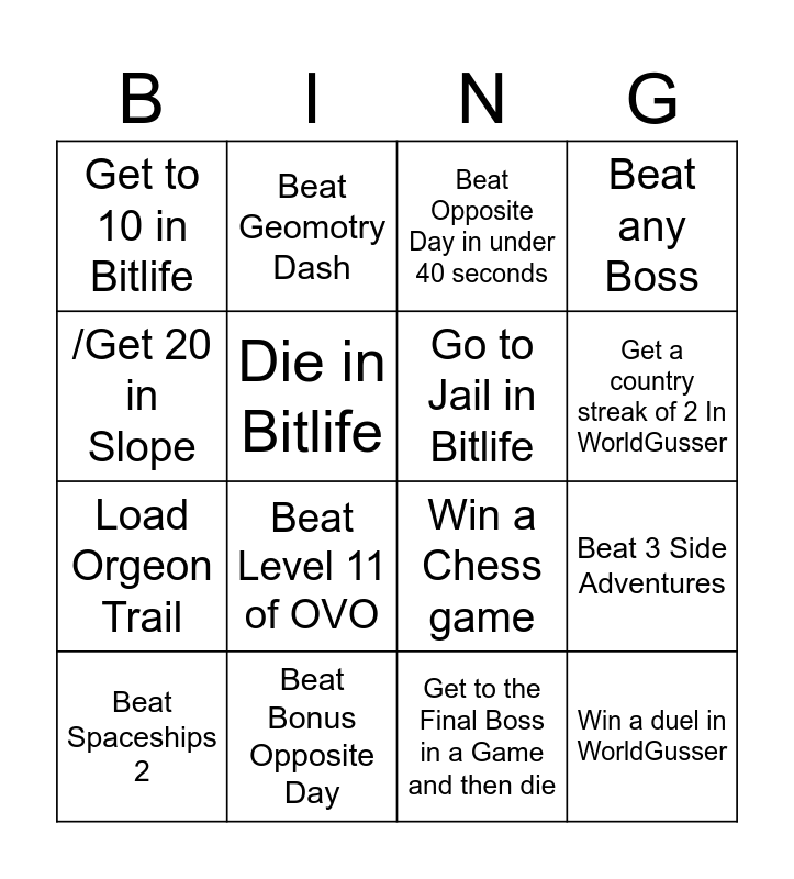 This bingo card has 16 words: Beat Spaceships 2, Beat Bonus Opposite Day, Beat Opposite Day in under 40 seconds, Beat any Boss, /Get 20 in Slope, Beat Geomotry Dash, Win a Chess game, Beat 3 Side Adventures, Get to 10 in Bitlife, Die in Bitlife, Get to the Final Boss in a Game and then die, Get a country streak of 2 In WorldGusser, Load Orgeon Trail, Beat Level 11 of OVO, Go to Jail in Bitlife and Win a duel in WorldGusser.