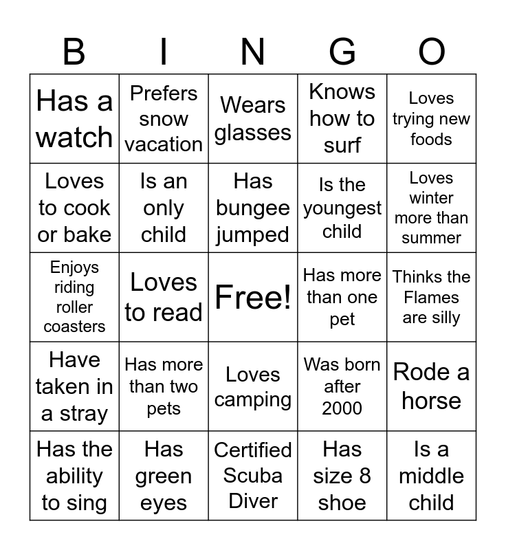 This bingo card has a free space and 85 words: Can play an instrument, Has a birthday this month!, Wears glasses, Has an iphone, Has an android, Has traveled outside the country, Loves to sing Karaoke, Loves to draw or paint, Had one healthy food item for breakfast, Plays video games, Has lived in another country, Is Left-handed, Is an only child, Has more than one pet, Has broken a bone, Has a watch, Has the ability to sing, Loves to cook or bake, Has never seen a Harry Potter movie, Dislikes chocolate, Is the oldest child, Is the youngest child, Is a middle child, Favorite color is blue, Loves to read, Loves to dance, Was born in another country, Climbed a mountain, Has never seen a Star Wars Film, Can speak more than one language, Has more than two pets, Has no facebook account, Has been snorkeling, Enjoys riding roller coasters, Prefers tea over coffee, Has walked/run a race, Certified Scuba Diver, Regularly Volunteers, Have taken in a stray, Loves winter more than summer, Never uses the snooze button, Has a garden, Was part of a talk show audience, Watches reality TV, Has taken a selfie with a celebrity, Has been snowboarding, Plays a musical instrument, Been sky diving, Has an aquarium, Knows a magic trick, Prefers snow vacation, Has bungee jumped, Named after a grand parent, Loves theme parks, Have a pet other than a cat or dog, Met someone famous, Has green eyes, Knows how to surf, Likes spicy food, Loves rainy days, Shares a name with an ancestor, Doesn’t like chocolate, Has flown in a helicopter, Prefers books to ebooks, Has a celebrity autograph, Loves trying new foods, Likes to get up early, Rode a horse, Lived overseas, Served in the military, Can drive a manual shift, Prefers a truck over a car, Has been to a tropical island, Has siblings, Has worked more than three jobs, Loves camping, Has size 8 shoe, Has met someone famous, Can make sourdough bread, Loves the Oilers, Thinks the Flames are silly, Loves to hike, Has more than 3 pets, Was born after 2000 and Was born before 1985.