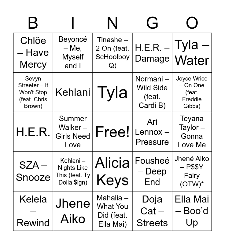 This bingo card has a free space and 40 words: SZA, H.E.R., Summer Walker, Kehlani, Jhene Aiko, Alicia Keys, Tyla, Coco Jones, Tyla – Water, SZA – Snooze, Summer Walker – Girls Need Love, H.E.R. – Damage, Ella Mai – Boo’d Up, Teyana Taylor – Gonna Love Me, Ari Lennox – Pressure, Kehlani – Nights Like This (feat. Ty Dolla $ign), Jazmine Sullivan – Pick Up Your Feelings, Chlöe – Have Mercy, Victoria Monét – On My Mama, Tinashe – 2 On (feat. ScHoolboy Q), Jhené Aiko – P$$Y Fairy (OTW)*, Doja Cat – Streets, Normani – Wild Side (feat. Cardi B), Sevyn Streeter – It Won't Stop (feat. Chris Brown), Kiana Ledé – Ex, Tink – Treat Me Like Somebody, Queen Naija – Medicine, Alina Baraz – Electric (feat. Khalid), Sabrina Claudio – Unravel Me, Amber Mark – What It Is, Nao – Another Lifetime, Kelela – Rewind, Ravyn Lenae – Sticky, Fousheé – Deep End, Joyce Wrice – On One (feat. Freddie Gibbs), Mahalia – What You Did (feat. Ella Mai), Snoh Aalegra – I Want You Around, Mariah the Scientist – Always n Forever (feat. Lil Baby), Beyoncé – Me, Myself and I and Rihanna – Love on the Brain.