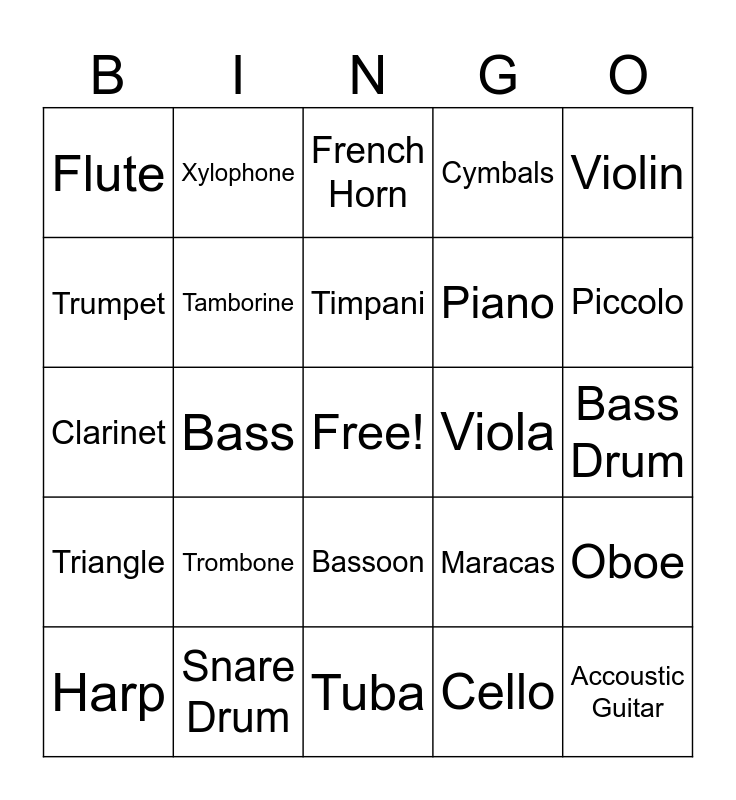This bingo card has a free space and 24 words: Trombone, Snare Drum, Timpani, Harp, Violin, Flute, Trumpet, Xylophone, Viola, Bassoon, Piano, Clarinet, Maracas, Oboe, Tamborine, Cello, Bass Drum, French Horn, Piccolo, Bass, Accoustic Guitar, Triangle, Cymbals and Tuba.