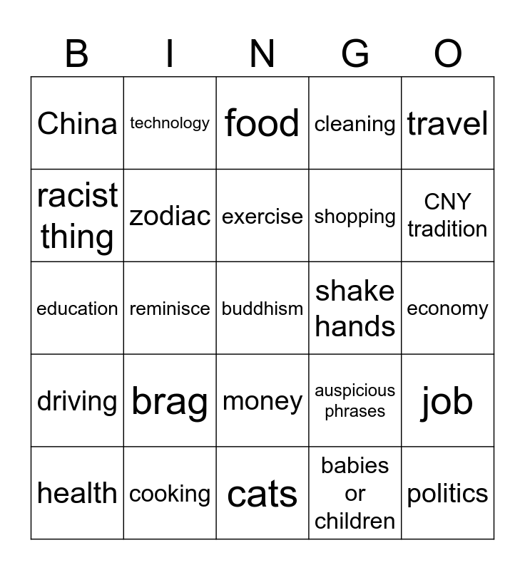 This bingo card has 25 words: brag, cats, exercise, health, travel, China, racist thing, technology, shake hands, money, shopping, education, auspicious phrases, job, zodiac, politics, economy, food, CNY tradition, reminisce, buddhism, cooking, driving, cleaning and babies or children.