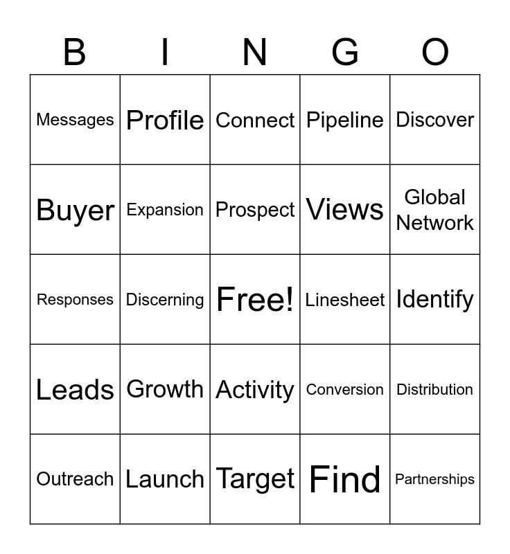 This bingo card has a free space and 24 words: Growth, Launch, Prospect, Outreach, Discover, Messages, Buyer, Profile, Linesheet, Activity, Views, Responses, Conversion, Distribution, Expansion, Find, Identify, Connect, Global Network, Discerning, Partnerships, Leads, Pipeline and Target.