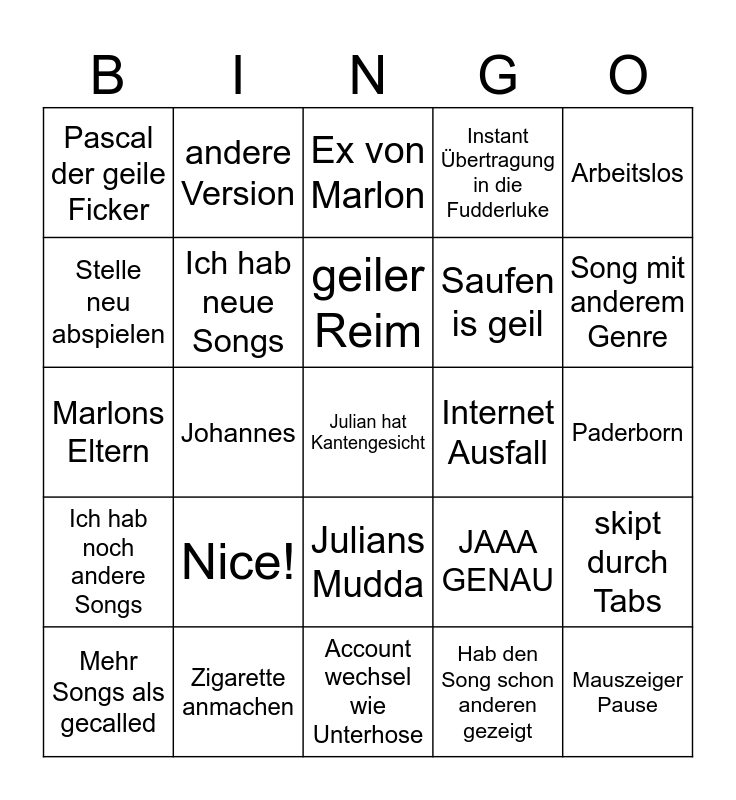 This bingo card has a free space and 24 words: Nice!, Zigarette anmachen, geiler Reim, Mehr Songs als gecalled, Arbeitslos, Pascal der geile Ficker, Stelle neu abspielen, andere Version, Internet Ausfall, Julians Mudda, Saufen is geil, Marlons Eltern, JAAA GENAU, skipt durch Tabs, Ich hab neue Songs, Hab den Song schon anderen gezeigt, Paderborn, Ex von Marlon, Song mit anderem Genre, Johannes, Mauszeiger Pause, Ich hab noch andere Songs, Instant Übertragung in die Fudderluke and Account wechsel wie Unterhose.