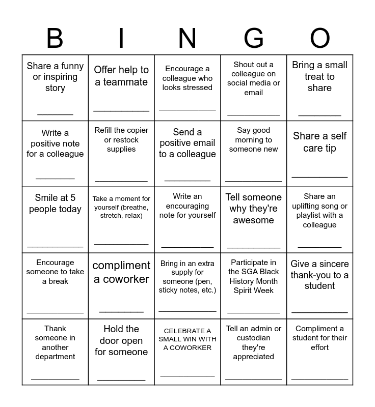 This bingo card has a free space and 24 words: compliment a coworker _______, Hold the door open for someone _________, Send a positive email to a colleague _________, Thank someone in another department ___________, Bring a small treat to share ________, Share a funny or inspiring story _______, Write a positive note for a colleague ________, Offer help to a teammate __________, Tell someone why they're awesome __________, Bring in an extra supply for someone (pen, sticky notes, etc.) ______________, Say good morning to someone new _____________, Smile at 5 people today ___________, Participate in the SGA Black History Month Spirit Week ____________, Give a sincere thank-you to a student ___________, Refill the copier or restock supplies ____________, Tell an admin or custodian they're appreciated _____________, Share an uplifting song or playlist with a colleague __________, Encourage a colleague who looks stressed _____________, Share a self care tip __________, Take a moment for yourself (breathe, stretch, relax) ______________, Compliment a student for their effort _____________, Encourage someone to take a break _____________, Shout out a colleague on social media or email ____________ and CELEBRATE A SMALL WIN WITH A COWORKER ______________.