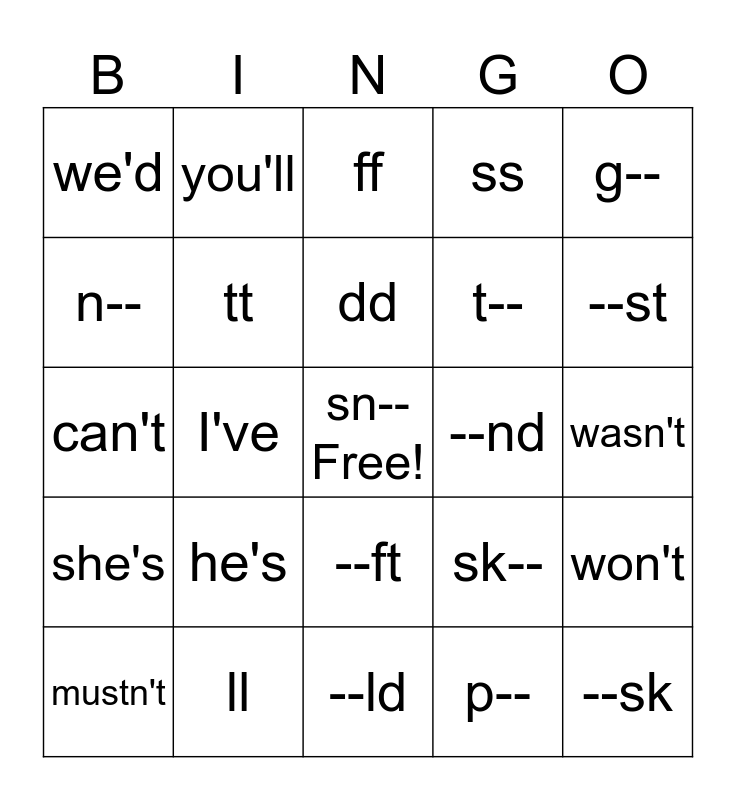 This bingo card has a free space and 37 words: --ct, --lp, they'll, tt, won't, he's, dd, j--, g--, cr--, I've, ss, --sk, wasn't, n--, she's, st--, ff, --ft, --nd, we'd, --st, mustn't, --ld, pp, p--, you'll, aren't, isn't, y--, they're, ll, can't, br--, sk--, t-- and m--.