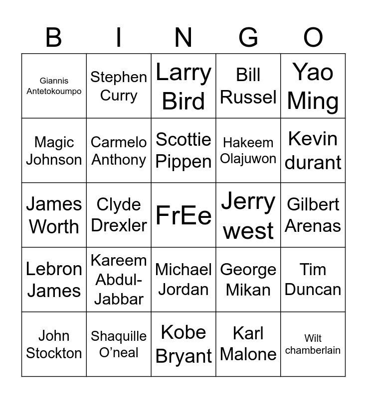 This bingo card has a free space and 24 words: Kareem Abdul-Jabbar, Shaquille O’neal, Scottie Pippen, John Stockton, Yao Ming, Giannis Antetokoumpo, Magic Johnson, Stephen Curry, Jerry west, Michael Jordan, Hakeem Olajuwon, James Worth, George Mikan, Tim Duncan, Carmelo Anthony, Karl Malone, Gilbert Arenas, Larry Bird, Kevin durant, Clyde Drexler, Wilt chamberlain, Lebron James, Bill Russel and Kobe Bryant.