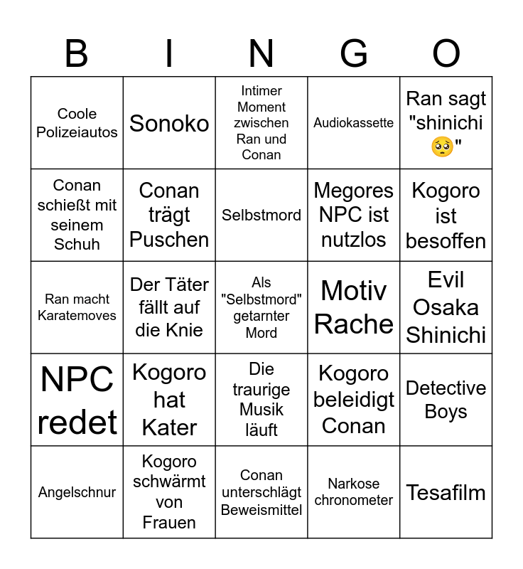 This bingo card has a free space and 24 words: Angelschnur, Kogoro hat Kater, Selbstmord, Narkose chronometer, Ran sagt "shinichi 🥺", Coole Polizeiautos, Sonoko, Intimer Moment zwischen Ran und Conan, Motiv Rache, Evil Osaka Shinichi, Ran macht Karatemoves, Conan trägt Puschen, Kogoro beleidigt Conan, Detective Boys, Conan schießt mit seinem Schuh, Kogoro schwärmt von Frauen, Conan unterschlägt Beweismittel, Audiokassette, Kogoro ist besoffen, NPC redet, Der Täter fällt auf die Knie, Die traurige Musik läuft, Megores NPC ist nutzlos and Tesafilm.