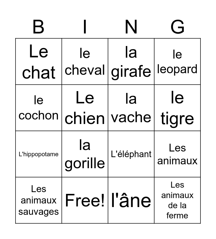 This bingo card has 25 words: Le chevre, Le lion, le tigre, la mouton, le cochon, Le chat, Le chien, le cheval, Free!, le lapin, L'hippopotame, L'éléphant, le coq, La poule, la vache, le taureau, l'âne, la girafe, la gorille, Les animaux, Les animaux sauvages, la tortue, Les animaux de la ferme, le leopard and Free!.