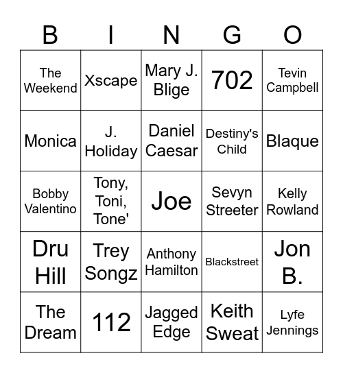 This bingo card has a free space and 24 words: Trey Songz, 112, Daniel Caesar, The Dream, Tevin Campbell, The Weekend, Monica, Xscape, Sevyn Streeter, Anthony Hamilton, Destiny's Child, Bobby Valentino, Blackstreet, Jon B., J. Holiday, Keith Sweat, Kelly Rowland, Mary J. Blige, Blaque, Tony, Toni, Tone', Lyfe Jennings, Dru Hill, 702 and Jagged Edge.
