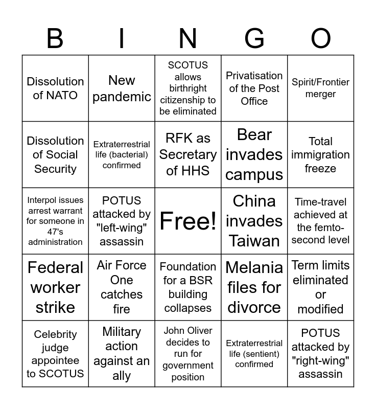 This bingo card has a free space and 24 words: Air Force One catches fire, Military action against an ally, RFK as Secretary of HHS, Celebrity judge appointee to SCOTUS, Spirit/Frontier merger, Dissolution of NATO, Dissolution of Social Security, New pandemic, China invades Taiwan, Foundation for a BSR building collapses, Bear invades campus, Interpol issues arrest warrant for someone in 47's administration, Melania files for divorce, Term limits eliminated or modified, Extraterrestrial life (bacterial) confirmed, Extraterrestrial life (sentient) confirmed, Time-travel achieved at the femto-second level, SCOTUS allows birthright citizenship to be eliminated, Total immigration freeze, POTUS attacked by "left-wing" assassin, POTUS attacked by "right-wing" assassin, Federal worker strike, Privatisation of the Post Office and John Oliver decides to run for government position.