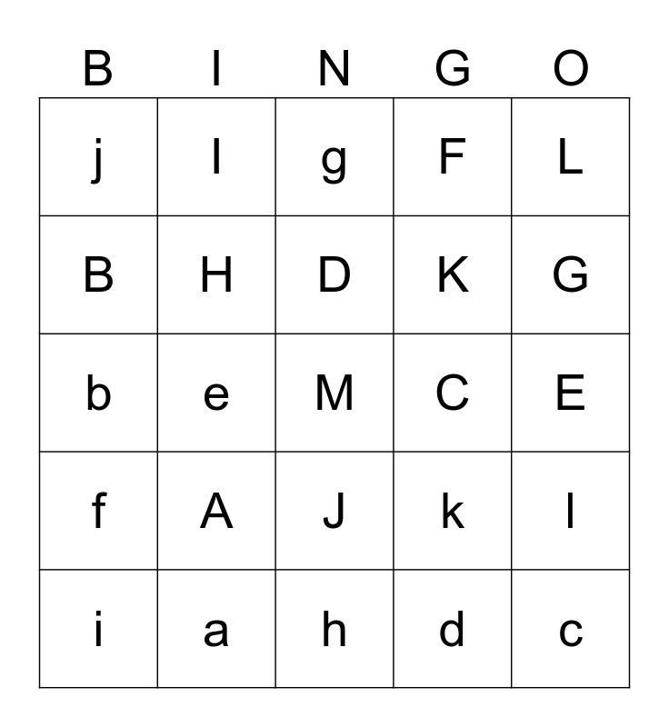 This bingo card has a free space and 24 words: A, a, D, i, L, j, B, I, C, J, K, b, k, l, H, d, E, g, G, e, c, f, F and h.