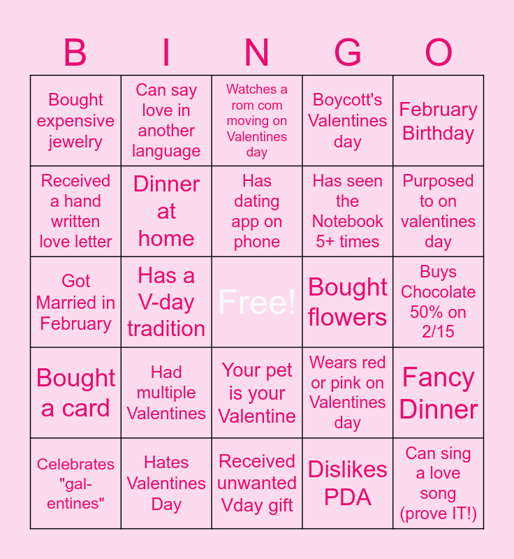This bingo card has a free space and 24 words: Had multiple Valentines, Hates Valentines Day, Has dating app on phone, Celebrates "gal-entines", February Birthday, Bought expensive jewelry, Received a hand written love letter, Can say love in another language, Bought flowers, Your pet is your Valentine, Has seen the Notebook 5+ times, Got Married in February, Wears red or pink on Valentines day, Fancy Dinner, Dinner at home, Dislikes PDA, Buys Chocolate 50% on 2/15, Watches a rom com moving on Valentines day, Purposed to on valentines day, Has a V-day tradition, Can sing a love song (prove IT!), Bought a card, Boycott's Valentines day and Received unwanted Vday gift.