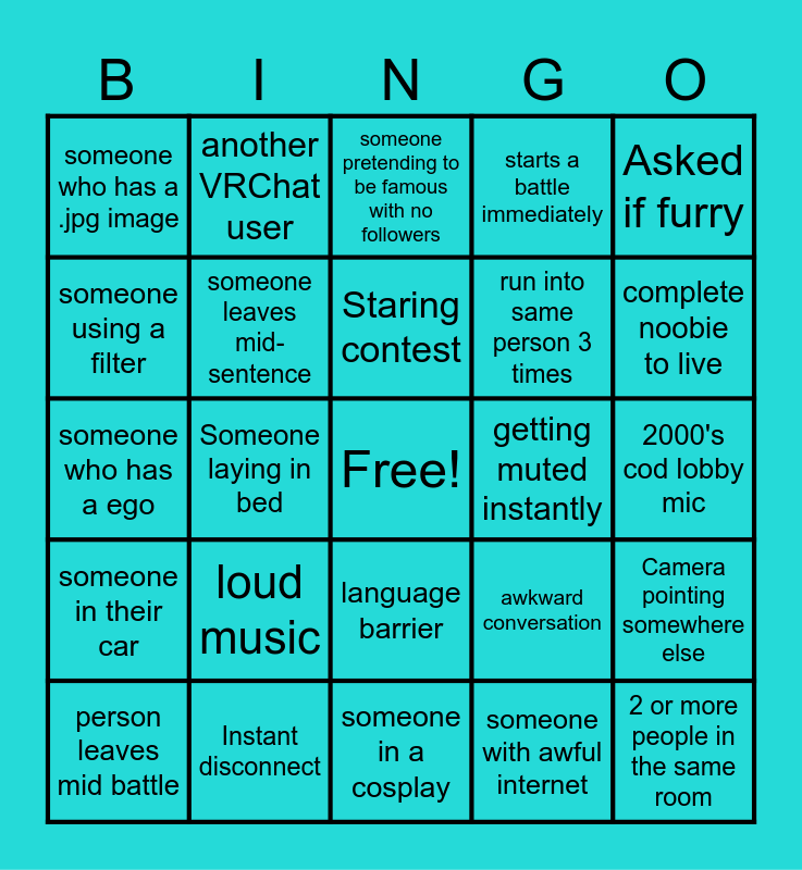This bingo card has a free space and 24 words: loud music, Instant disconnect, Staring contest, person leaves mid battle, Asked if furry, someone who has a .jpg image, someone using a filter, another VRChat user, getting muted instantly, language barrier, run into same person 3 times, someone who has a ego, awkward conversation, Camera pointing somewhere else, someone leaves mid-sentence, someone with awful internet, 2000's cod lobby mic, someone pretending to be famous with no followers, complete noobie to live, Someone laying in bed, 2 or more people in the same room, someone in their car, starts a battle immediately and someone in a cosplay.