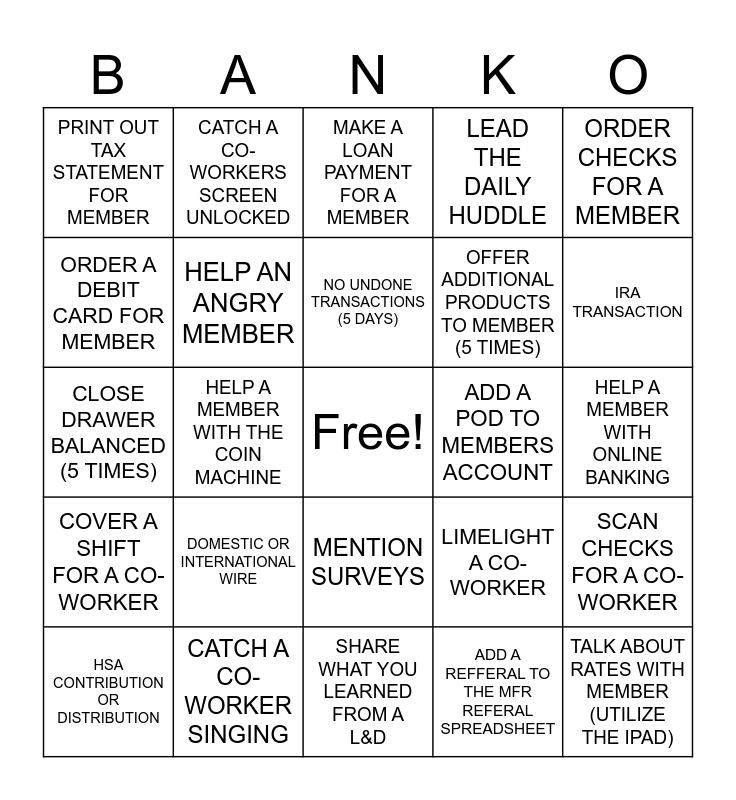 This bingo card has a free space and 24 words: DOMESTIC OR INTERNATIONAL WIRE, CATCH A CO-WORKER SINGING, NO UNDONE TRANSACTIONS (5 DAYS), HSA CONTRIBUTION OR DISTRIBUTION, ORDER CHECKS FOR A MEMBER, PRINT OUT TAX STATEMENT FOR MEMBER, ORDER A DEBIT CARD FOR MEMBER, CATCH A CO-WORKERS SCREEN UNLOCKED, ADD A POD TO MEMBERS ACCOUNT, MENTION SURVEYS, OFFER ADDITIONAL PRODUCTS TO MEMBER (5 TIMES), CLOSE DRAWER BALANCED (5 TIMES), LIMELIGHT A CO-WORKER, SCAN CHECKS FOR A CO-WORKER, HELP AN ANGRY MEMBER, ADD A REFFERAL TO THE MFR REFERAL SPREADSHEET, HELP A MEMBER WITH ONLINE BANKING, MAKE A LOAN PAYMENT FOR A MEMBER, IRA TRANSACTION, HELP A MEMBER WITH THE COIN MACHINE, TALK ABOUT RATES WITH MEMBER (UTILIZE THE IPAD), COVER A SHIFT FOR A CO-WORKER, LEAD THE DAILY HUDDLE and SHARE WHAT YOU LEARNED FROM A L&D.
