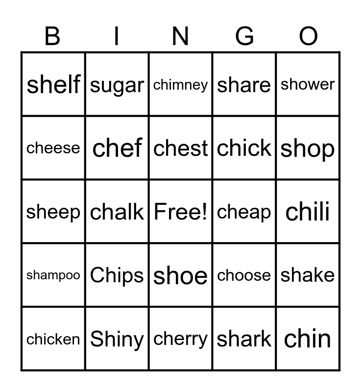 This bingo card has a free space and 24 words: Chips, Shiny, chest, chicken, shower, shelf, cheese, sugar, cheap, shoe, chick, sheep, choose, shake, chef, shark, chili, chimney, shop, chalk, chin, shampoo, share and cherry.