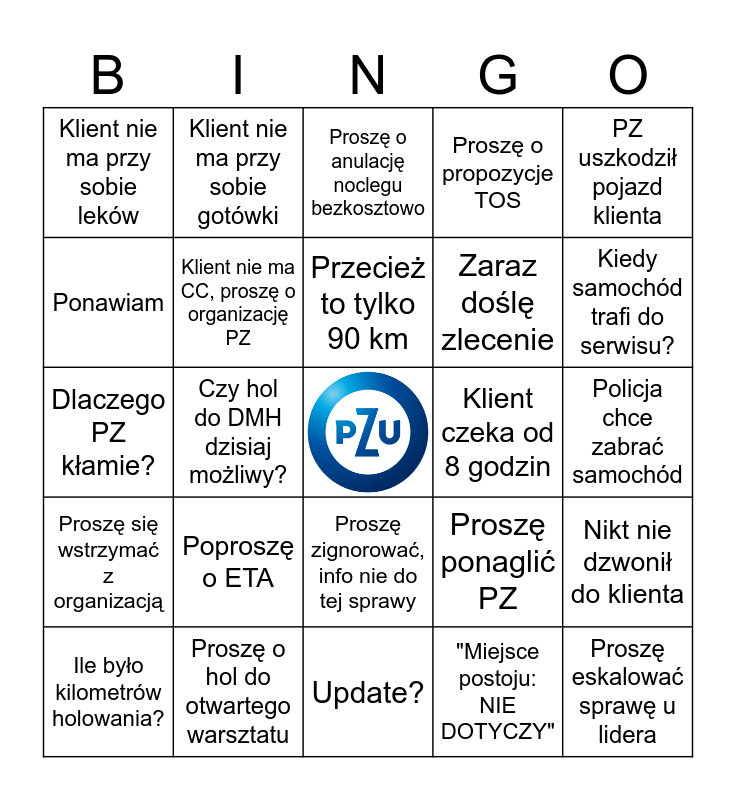 This bingo card has a free space and 24 words: Poproszę o ETA, Proszę o hol do otwartego warsztatu, Przecież to tylko 90 km, Ile było kilometrów holowania?, PZ uszkodził pojazd klienta, Klient nie ma przy sobie leków, Ponawiam, Klient nie ma przy sobie gotówki, Klient czeka od 8 godzin, Proszę zignorować, info nie do tej sprawy, Zaraz doślę zlecenie, Dlaczego PZ kłamie?, Proszę ponaglić PZ, Nikt nie dzwonił do klienta, Klient nie ma CC, proszę o organizację PZ, "Miejsce postoju: NIE DOTYCZY", Policja chce zabrać samochód, Proszę o anulację noclegu bezkosztowo, Kiedy samochód trafi do serwisu?, Czy hol do DMH dzisiaj możliwy?, Proszę eskalować sprawę u lidera, Proszę się wstrzymać z organizacją, Proszę o propozycje TOS and Update?.