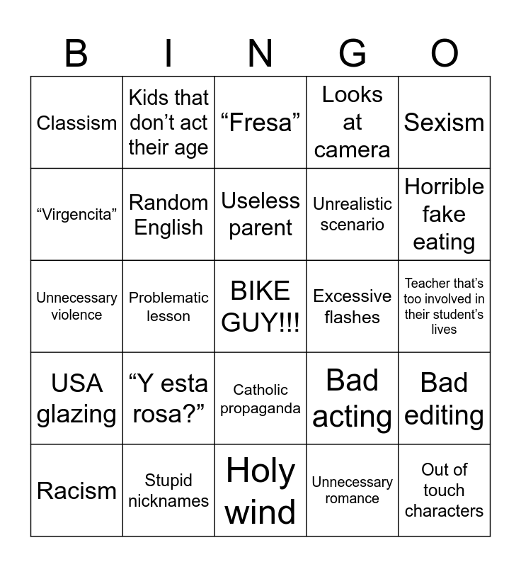 This bingo card has a free space and 25 words: “Y esta rosa?”, Holy wind, Useless parent, Racism, Sexism, Classism, “Virgencita”, Kids that don’t act their age, Excessive flashes, Catholic propaganda, Unrealistic scenario, Unnecessary violence, Bad acting, Bad editing, Random English, “Quieres ser mi chava?”, Teacher that’s too involved in their student’s lives, “Fresa”, Horrible fake eating, Problematic lesson, Out of touch characters, Stupid nicknames, USA glazing, Looks at camera and Unnecessary romance.
