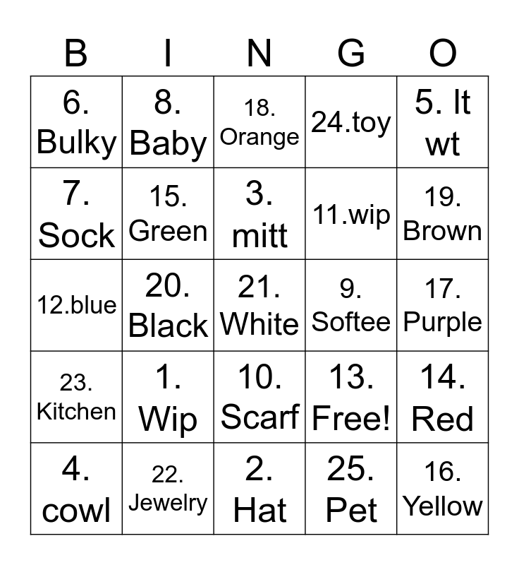 This bingo card has 25 words: 1. Wip, 2. Hat, 3. mitt, 4. cowl, 5. lt wt, 6. Bulky, 7. Sock, 8. Baby, 9. Softee, 10. Scarf, 11.wip, 12.blue, 13. Free!, 14. Red, 15. Green, 16. Yellow, 17. Purple, 18. Orange, 19. Brown, 20. Black, 21. White, 22. Jewelry, 23. Kitchen, 24.toy and 25. Pet.
