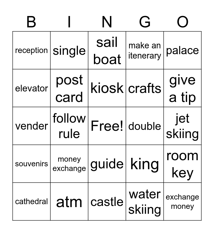 This bingo card has a free space and 24 words: money exchange, atm, kiosk, cathedral, palace, reception, elevator, single, double, guide, crafts, vender, king, room key, post card, water skiing, jet skiing, sail boat, give a tip, follow rule, exchange money, souvenirs, make an itenerary and castle.