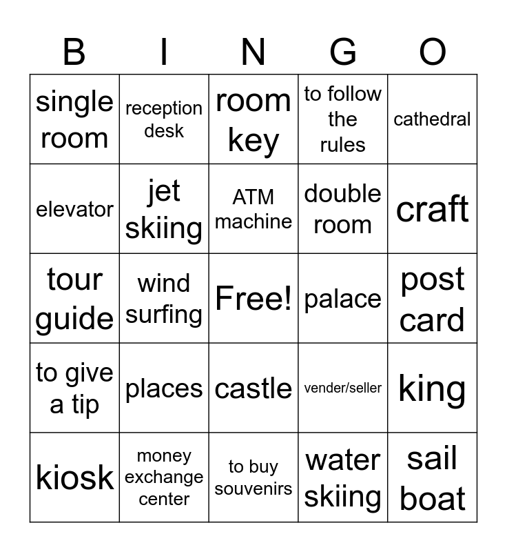 This bingo card has a free space and 24 words: places, money exchange center, ATM machine, kiosk, cathedral, single room, elevator, reception desk, palace, castle, double room, tour guide, vender/seller, king, jet skiing, water skiing, post card, room key, craft, wind surfing, sail boat, to give a tip, to follow the rules and to buy souvenirs.