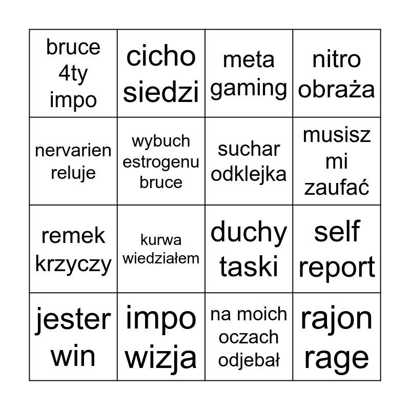 This bingo card has 16 words: impo wizja, self report, meta gaming, bruce 4ty impo, remek krzyczy, cicho siedzi, duchy taski, na moich oczach odjebał, nervarien reluje, wybuch estrogenu bruce, jester win, nitro obraża, kurwa wiedziałem, musisz mi zaufać, suchar odklejka and rajon rage.