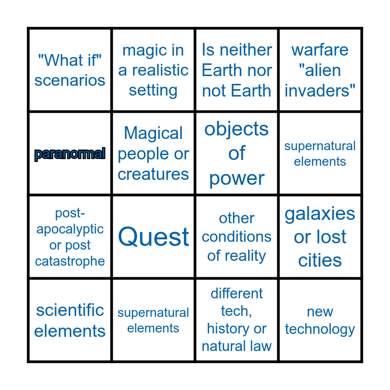 This bingo card has 18 words: Quest, new technology, Is neither Earth nor not Earth, "What if" scenarios, other conditions of reality, warfare "alien invaders", scientific elements, magic in a realistic setting, supernatural elements, post-apocalyptic or post catastrophe, different tech, history or natural law, paranormal, galaxies or lost cities, Magical people or creatures, objects of power, different rules of logic, supernatural elements and other conditions of reality.