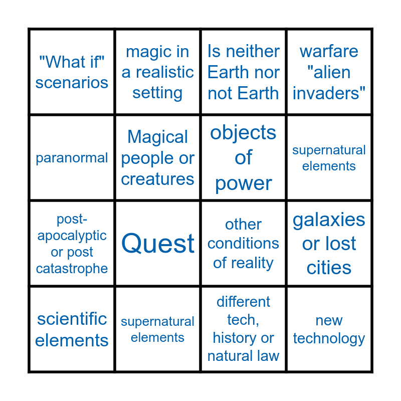 This bingo card has 18 words: Quest, new technology, Is neither Earth nor not Earth, "What if" scenarios, other conditions of reality, warfare "alien invaders", scientific elements, magic in a realistic setting, supernatural elements, post-apocalyptic or post catastrophe, different tech, history or natural law, paranormal, galaxies or lost cities, Magical people or creatures, objects of power, different rules of logic, supernatural elements and other conditions of reality.